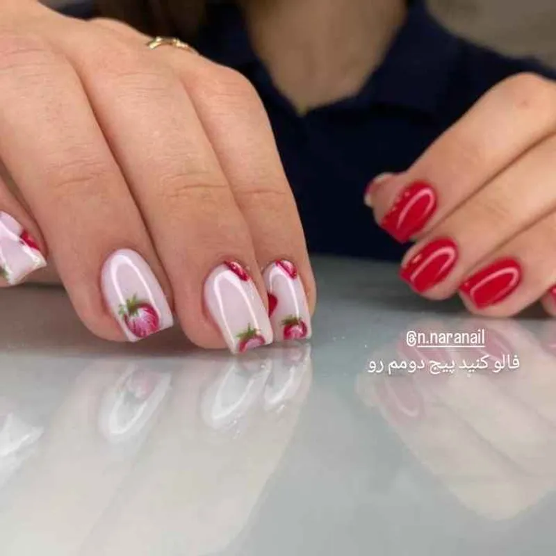 مدل ناخن میوهای توتفرنگی یکی از محبوبترین طرحهاست که با ظاهر قرمز و دانههای ریزش خیلی شبیه به میوه واقعی به نظر میرسه. این طرح با ترکیب رنگهای قرمز، سفید و سبز ظاهری شاد و جذاب به ناخنها میده و برای فصلهای بهار و تابستون خیلی پرطرفداره. ناخن با طرح میوه توتفرنگی هم برای ناخنهای کوتاه و هم بلند مناسبه و میتونید اون رو با لاک ساده یا ژل ناخن اجرا کنید. اگه به دنبال یه طرح ناخن با میوه فانتزی و زیبا هستید، طرح توتفرنگی میتونه یه انتخاب عالی باشه.