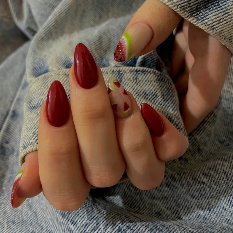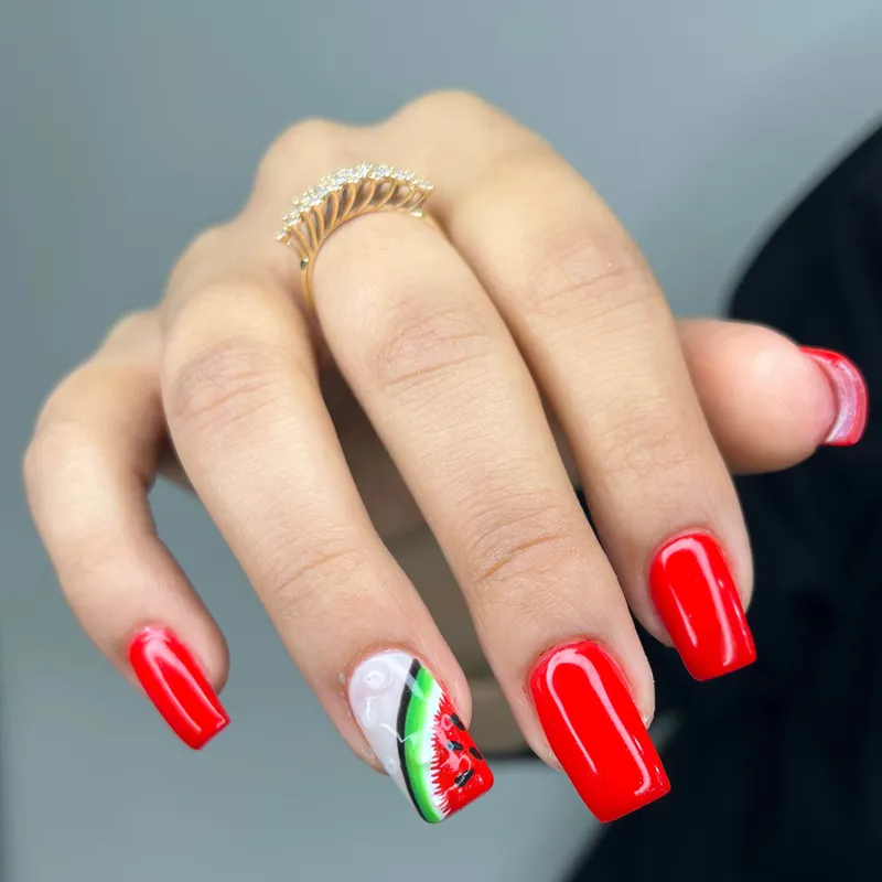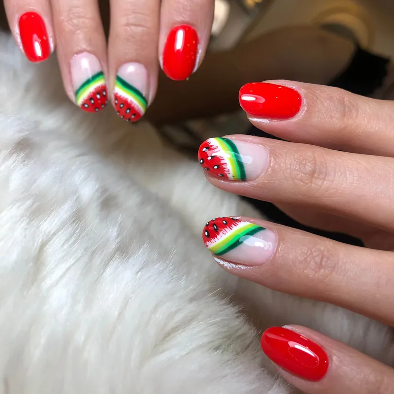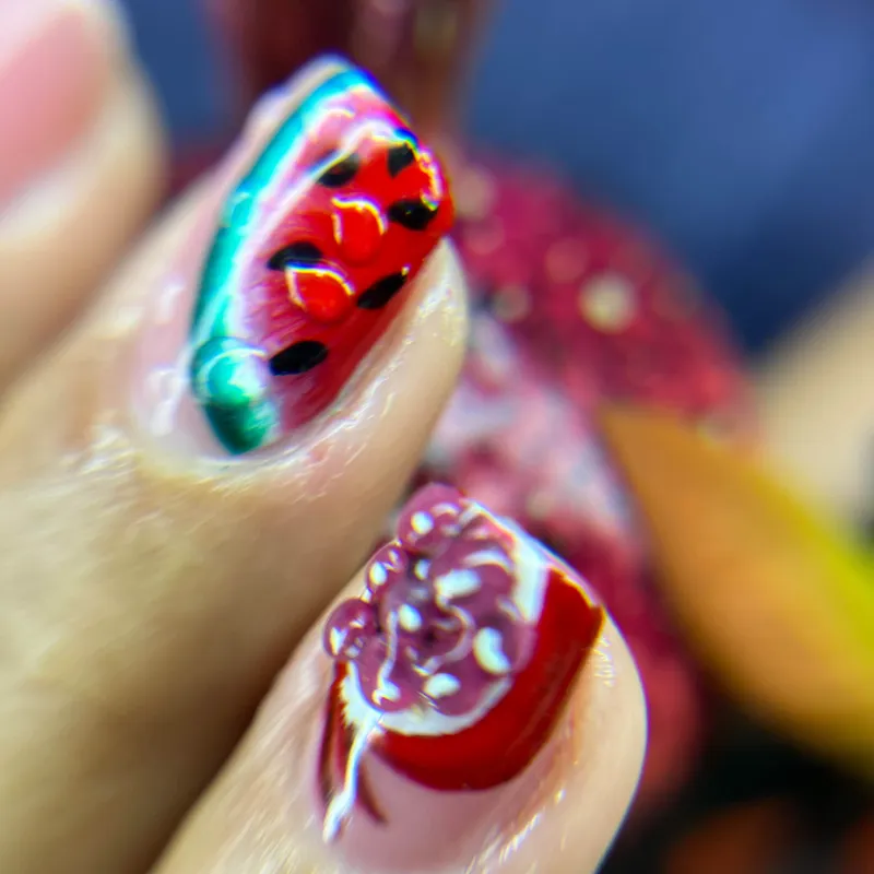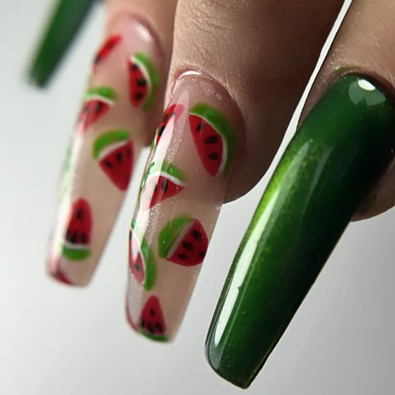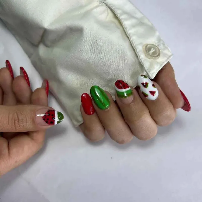 مدل ناخن میوه ای هندوانه یکی از شادترین و پرطرفدارترین انواع طراحی ناخن میوه تابستانی و یا زمستانی هستش که حس تابستون و خنکی رو به ناخنهاتون میاره. این طراحی ناخن با میوه با ترکیب رنگهای سبز، قرمز و نقطههای مشکی مثل دونههای هندونه، ظاهری جالب و متفاوت داره. اگه دنبال یه طرح ساده ولی شیک و پرانرژی هستید، ناخن هندونهای میتونه انتخابی عالی باشه.